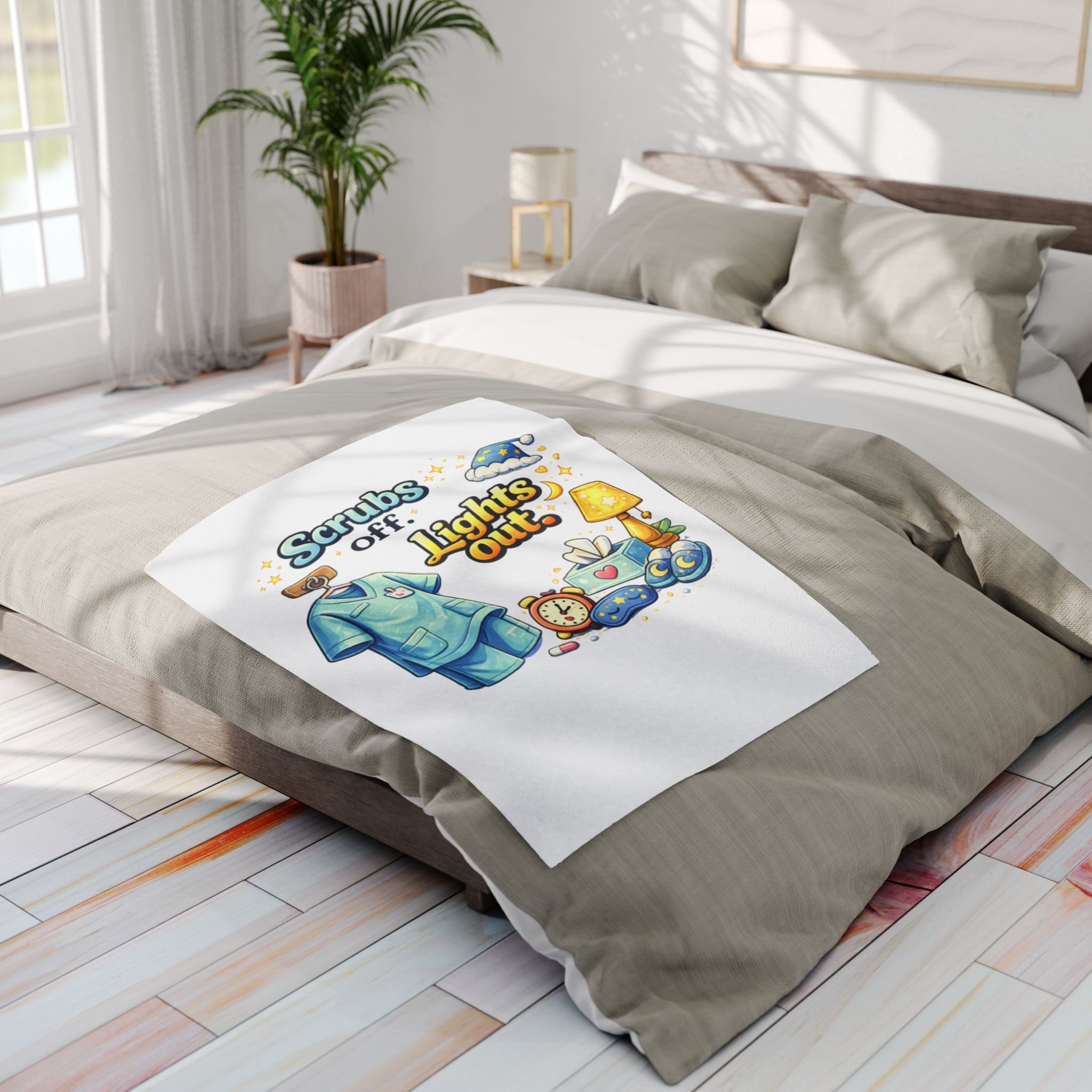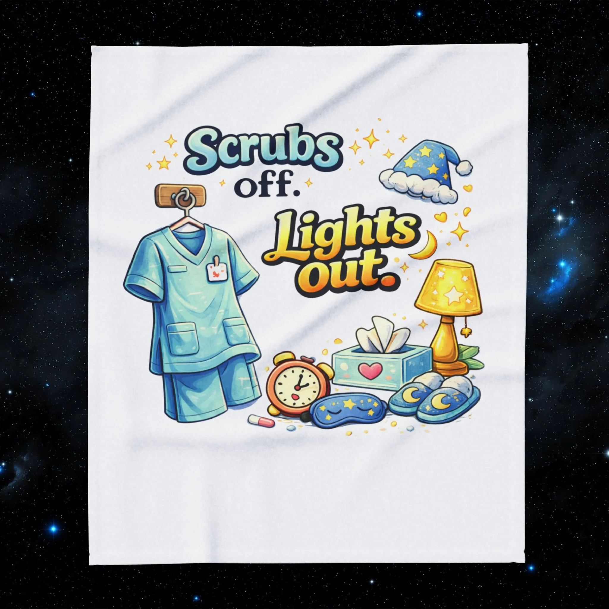 Wrap yourself in bright, cozy optimism with this plush fleece blanket. Illustrated in lively, candy-colored lettering and playful doodles, the design reads like a cheerful manifesto: "Scrubs off. Lights out..." a nod to creators, caregivers turned advocates, and anyone in the medical field. The thick, double-sided fluffy polyester feels soft against skin and keeps the chill away during late-night brainstorming, long reads, or peaceful couch naps. Whether draped over a favorite chair or folded at the foot of a bed, it brings a warm splash of color and a gentle reminder to honor hope and creativity.