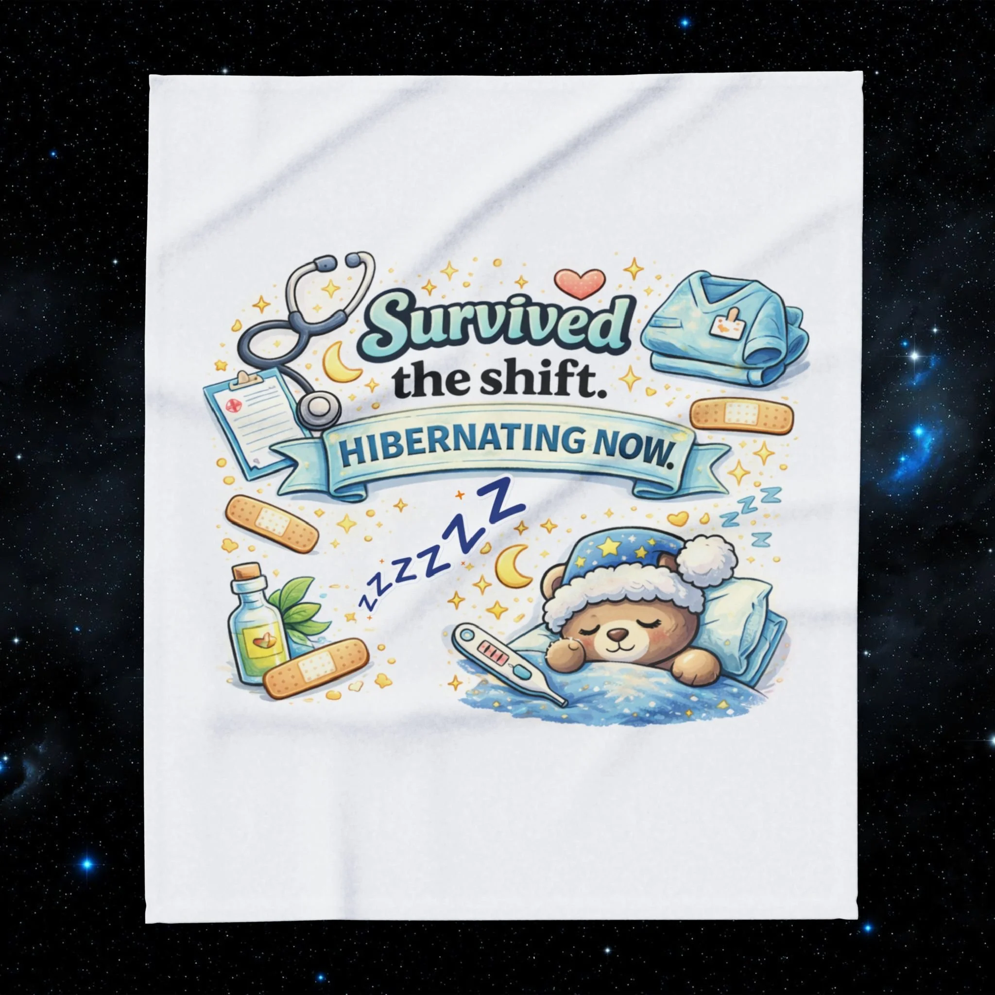 Wrap yourself in bright, cozy optimism with this plush fleece blanket. Illustrated in lively, candy-colored lettering and playful doodles, the design reads like a cheerful manifesto: "Survived the shift. Hibernating now..." a nod to creators, caregivers turned advocates, and anyone in the medical field. The thick, double-sided fluffy polyester feels soft against skin and keeps the chill away during late-night brainstorming, long reads, or peaceful couch naps. Whether draped over a favorite chair or folded at the foot of a bed, it brings a warm splash of color and a gentle reminder to honor hope and creativity.