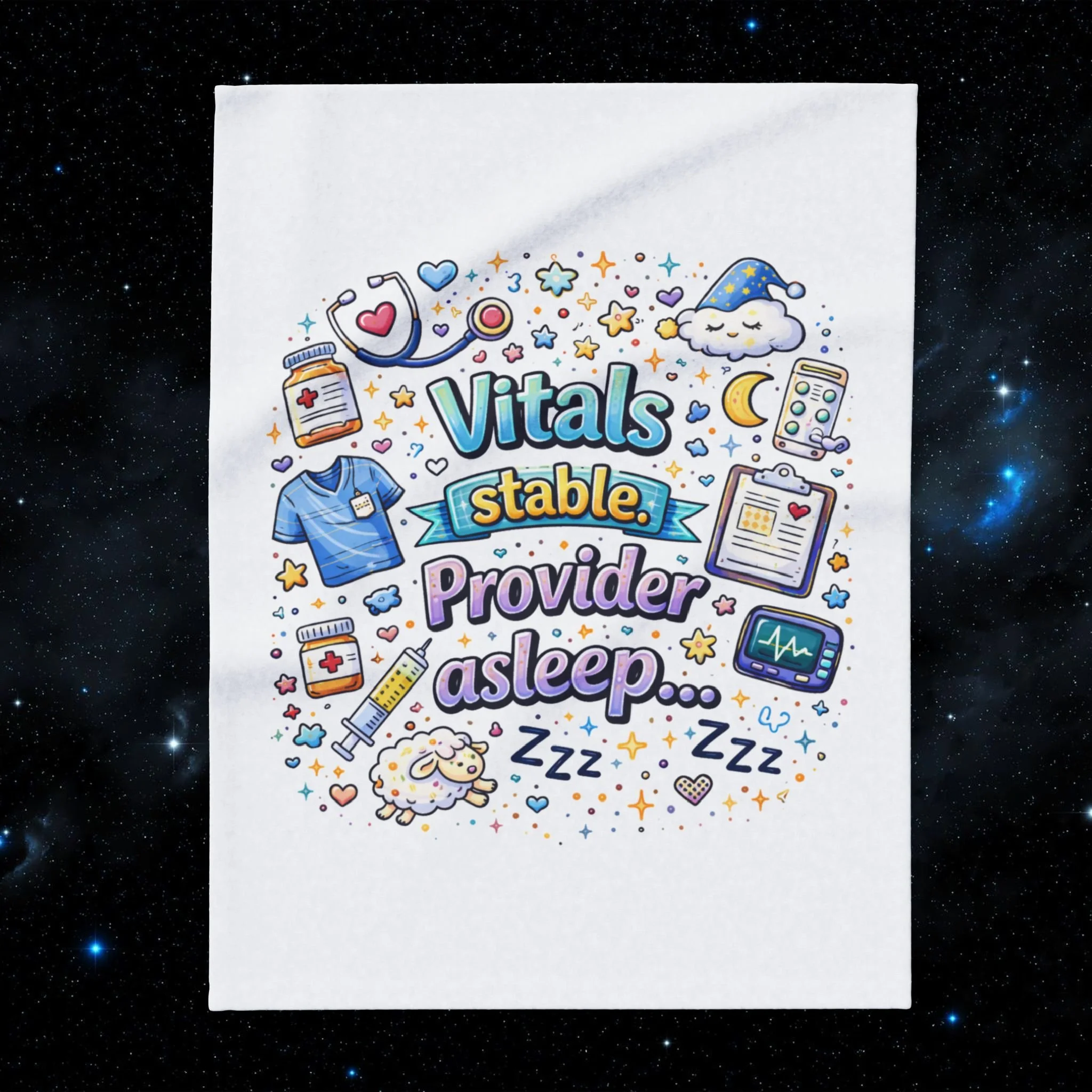 Wrap yourself in bright, cozy optimism with this plush fleece blanket. Illustrated in lively, candy-colored lettering and playful doodles, the design reads like a cheerful manifesto: "Vitals stable. Provider asleep..." a nod to creators, caregivers turned advocates, and anyone in the medical field. The thick, double-sided fluffy polyester feels soft against skin and keeps the chill away during late-night brainstorming, long reads, or peaceful couch naps. Whether draped over a favorite chair or folded at the foot of a bed, it brings a warm splash of color and a gentle reminder to honor hope and creativity.